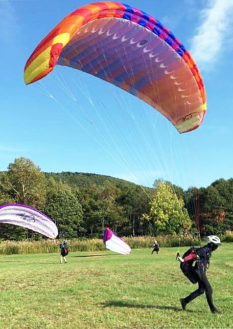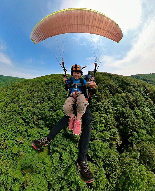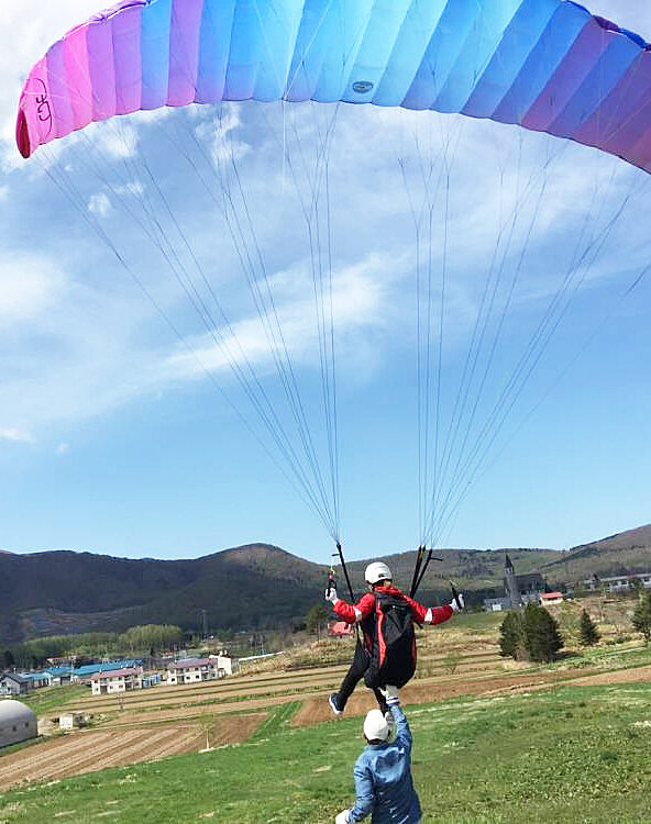 より高い空を目指したい方には、インストラクターと一緒に約400mの山頂から飛び出す「タンデムフライト(2人乗り)」。カルデラの里、赤井川のパノラマビューを独り占めする特別な時間をお約束します。