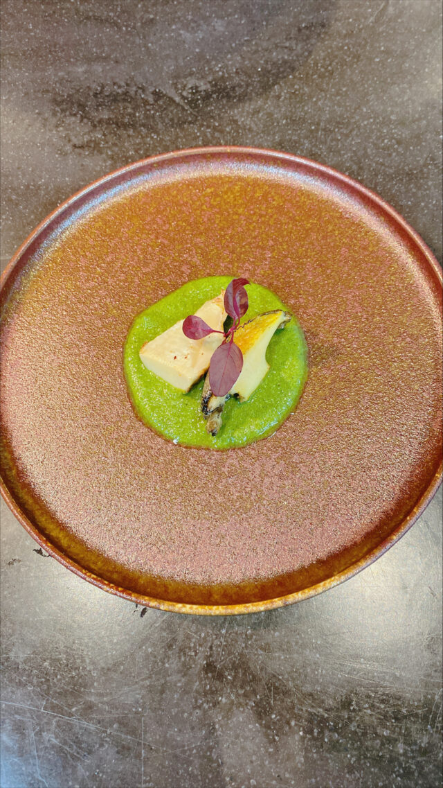 - 筍と鮑のソテー 行者にんにくのジェノヴェーゼ